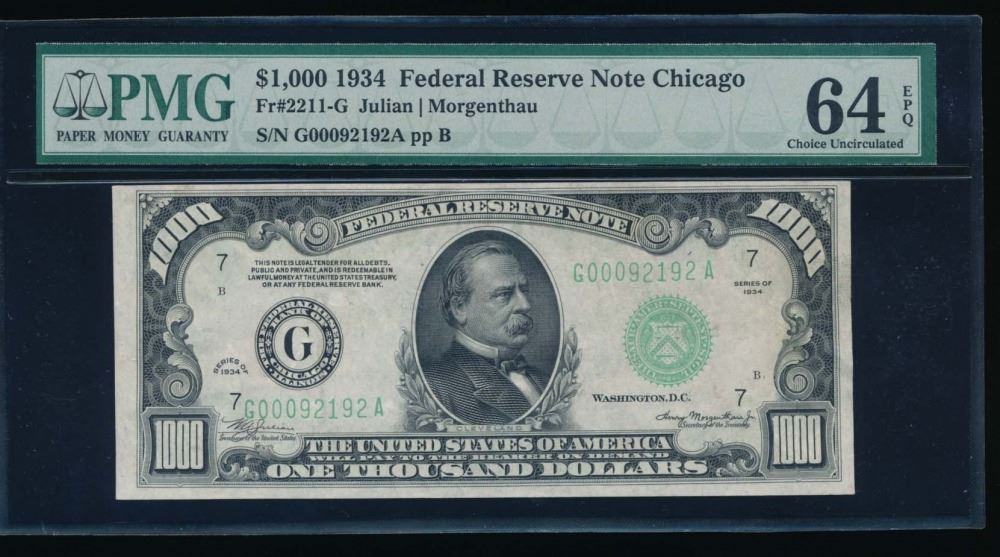 One 1934 $1000 Chicago Federal Reserve Note PMG 64EPQ.