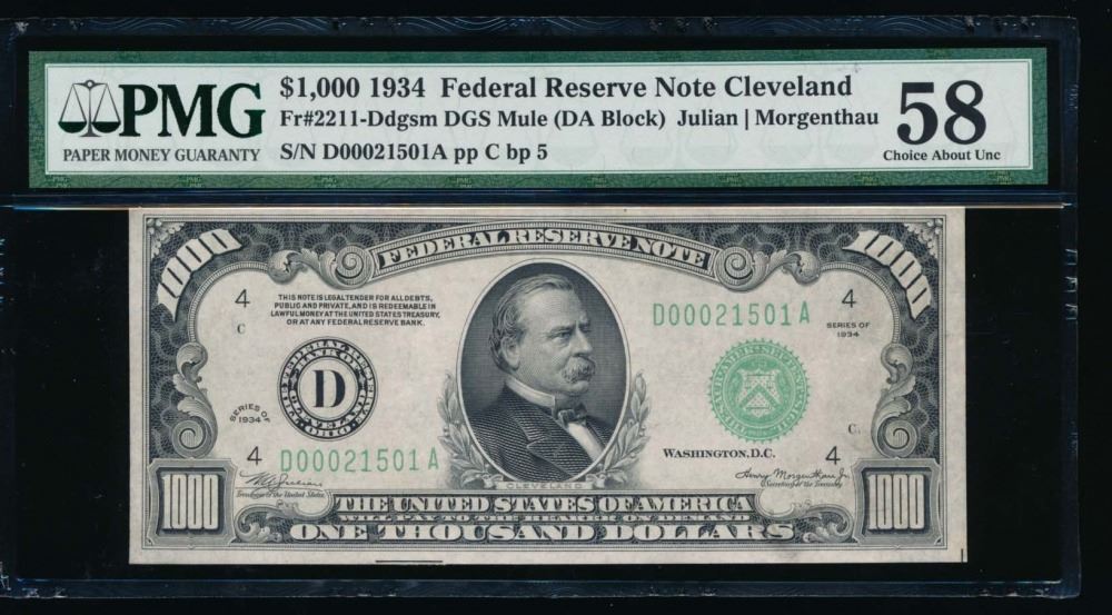 One 1934 $1000 Cleveland Federal Reserve Note PMG 58.