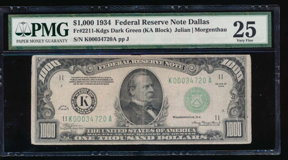 One 1934 $1000 Federal Reserve Note PMG 25.