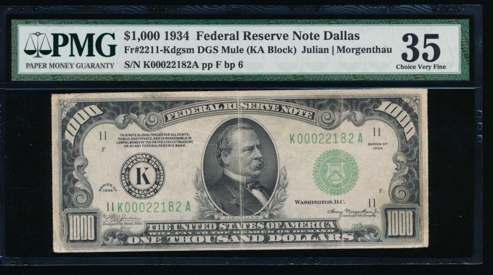 One 1934 $1000 Dallas Federal Reserve Note PMG 35.