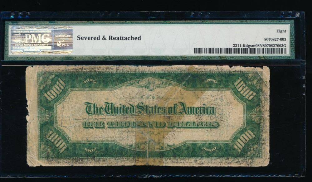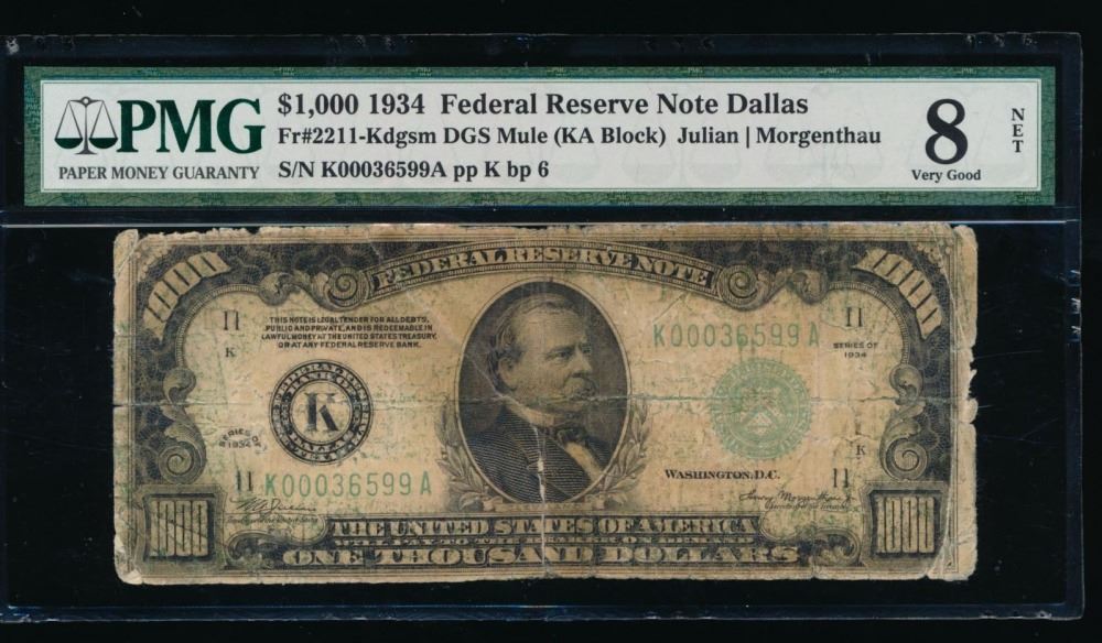 One 1934 $1000 Dallas Federal Reserve Note PMG 8NET.