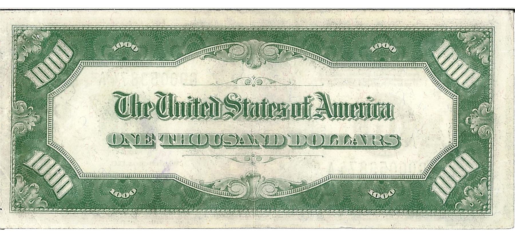 One 1934 $1000 Federal Reserve Bank Note Chicago. The serial number is 53874.