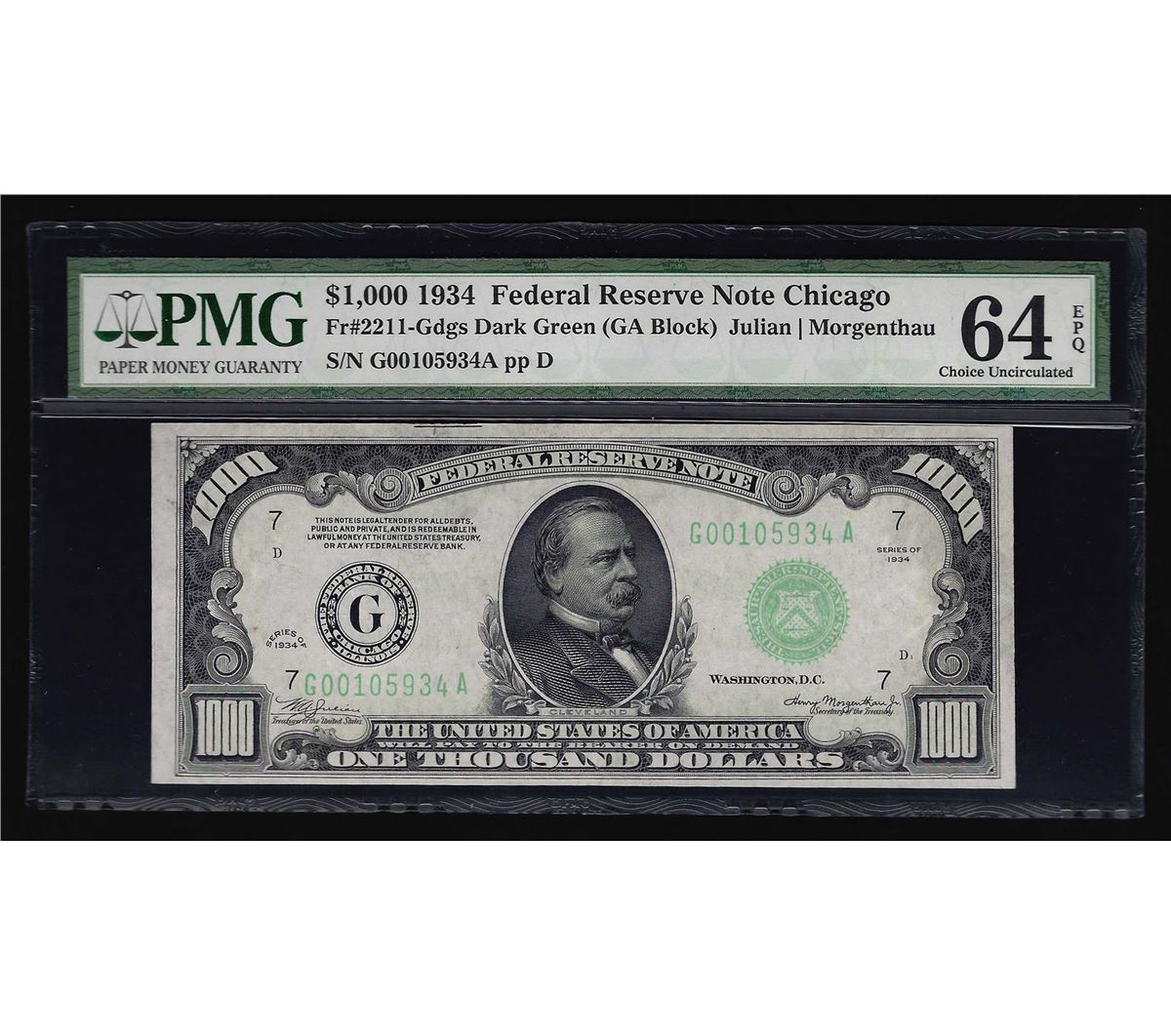 One 1934 $1000 Federal Reserve Note Chicago PMG Choice Uncirculated 64EPQ. PMG Certified.