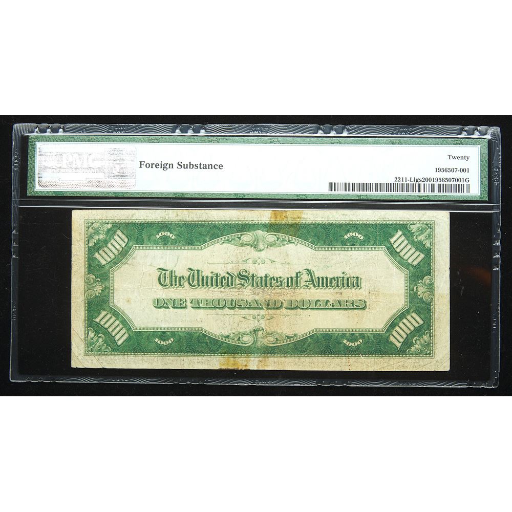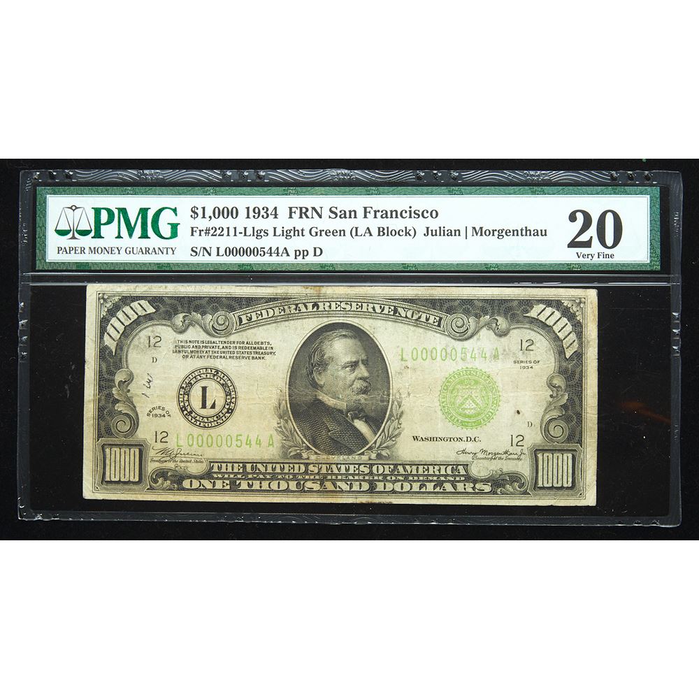 1934, 1000 Federal Reserve Note. San Francisco. Fr-2211-L. Light Green. S/N L00000544A ppd. PMG graded Very Fine 20, Foreign Substance. Estimated Value 1,200 - 1,250