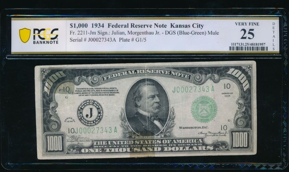 One 1934 $1000 Kansas City FRN PCGS 25.