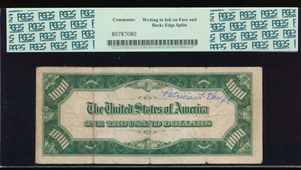 One 1934 $1000 Kansas City Federal Reserve Note PCGS 12. Writing in ink on face and back. Edge splits.