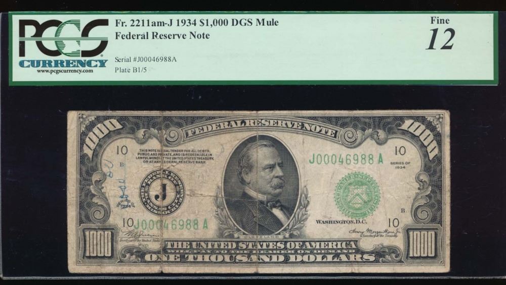 One 1934 $1000 Kansas City Federal Reserve Note PCGS 12. Writing in ink on face and back. Edge splits.