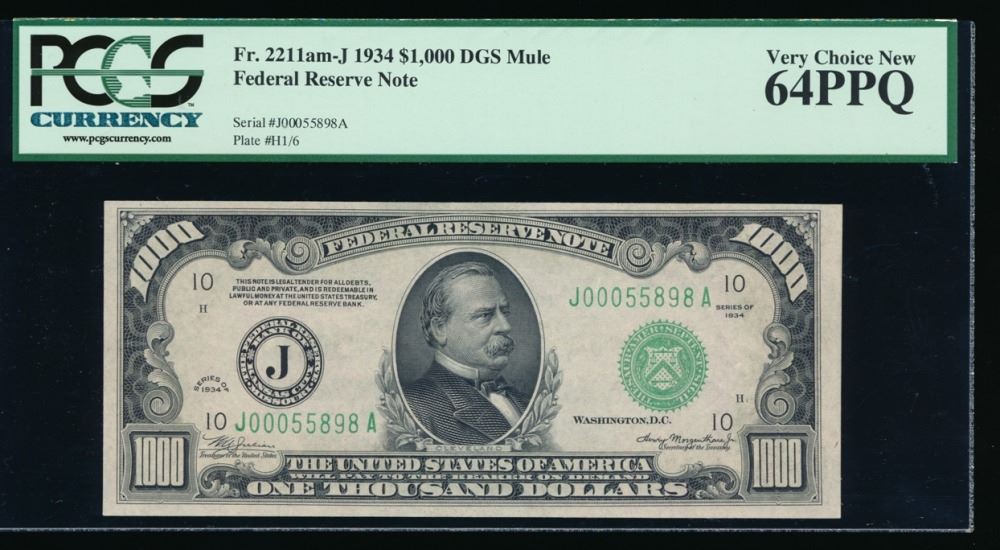 One 1934 $1000 Kansas City Federal Reserve Note PCGS 64PPQ.
