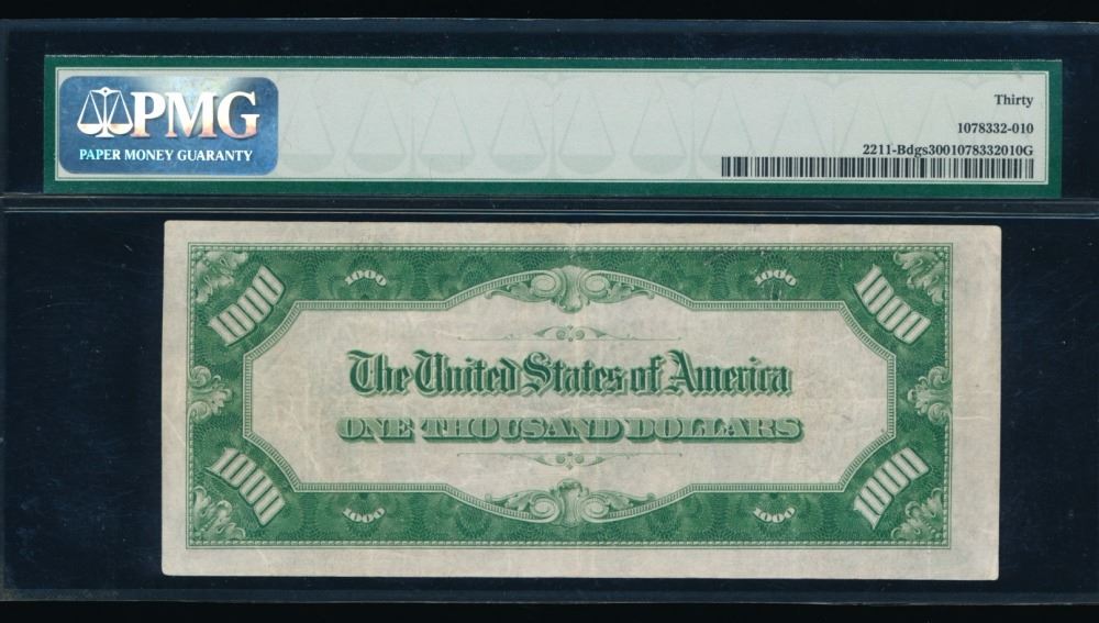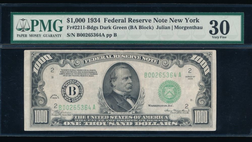 One 1934 $1000 New York Federal Reserve Bank Note PMG 30.