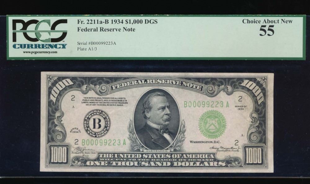 One 1934 $1000 New York Federal Reserve Note PCGS 55.