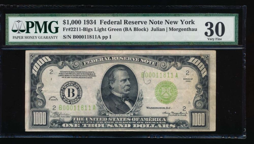 One 1934 $1000 New York Federal Reserve Note PMG 30.