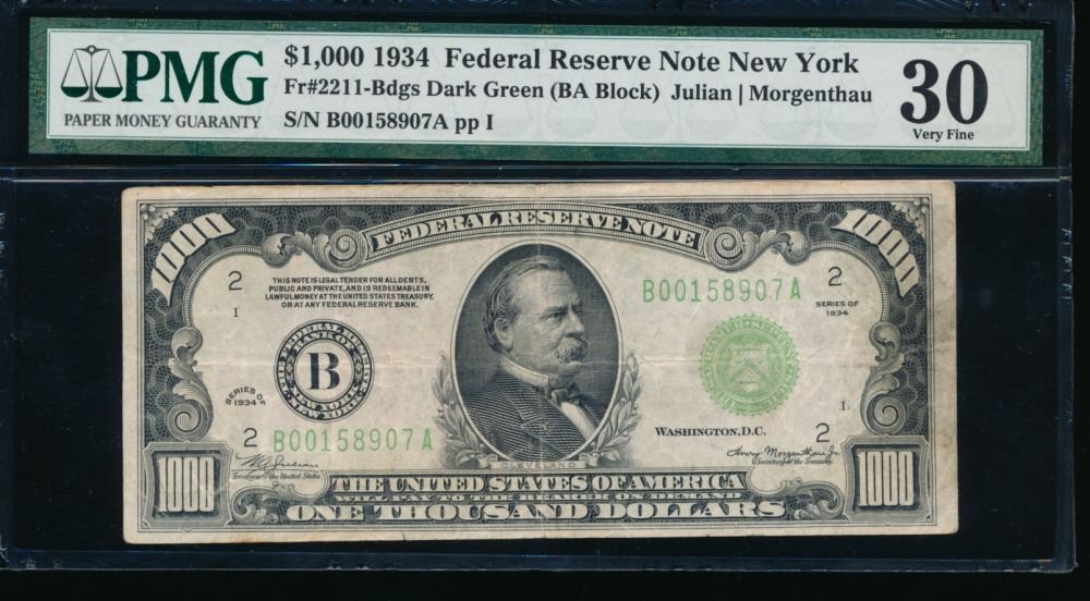 One 1934 $1000 New York Federal Reserve Note PMG 30.
