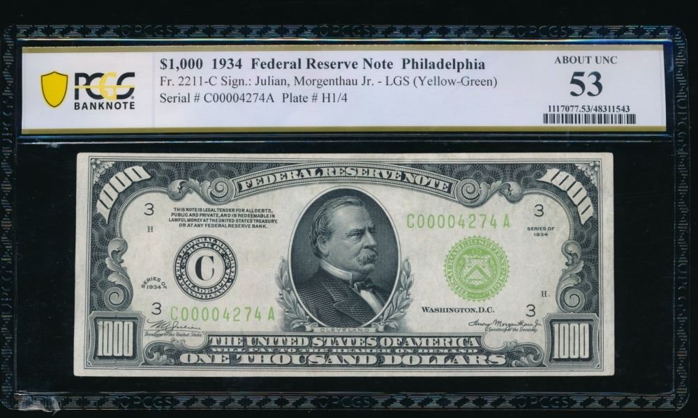 One 1934 $1000 Philadelphia FRN PMG 53.