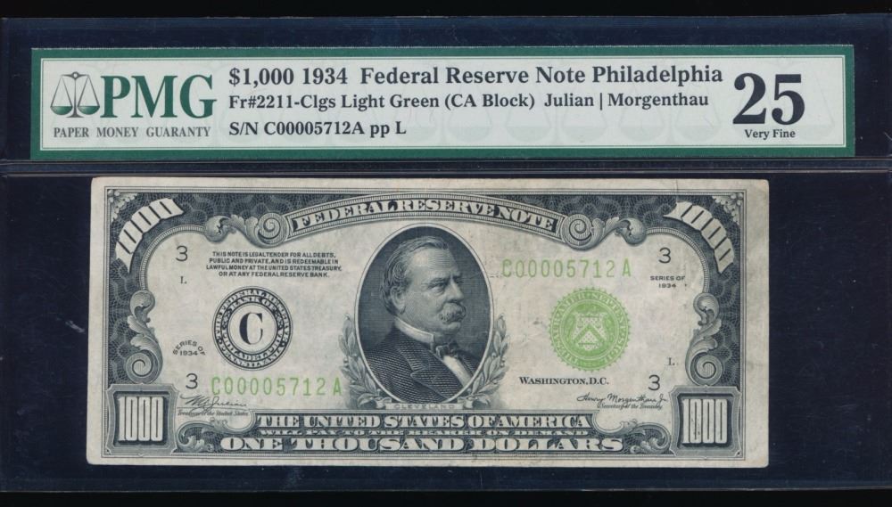 One 1934 $1000 Philadelphia Federal Reserve Bank Note PMG 25.