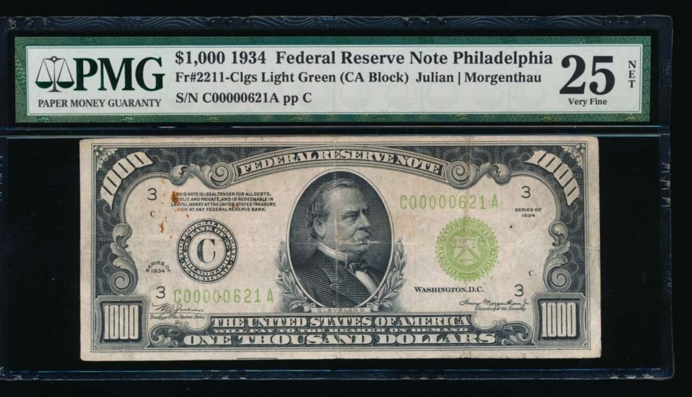One 1934 $1000 Philadelphia Federal Reserve Note PMG 25NET.