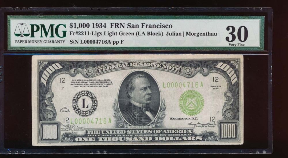 One 1934 $1000 San Francisco Federal Reserve Note PMG 30.