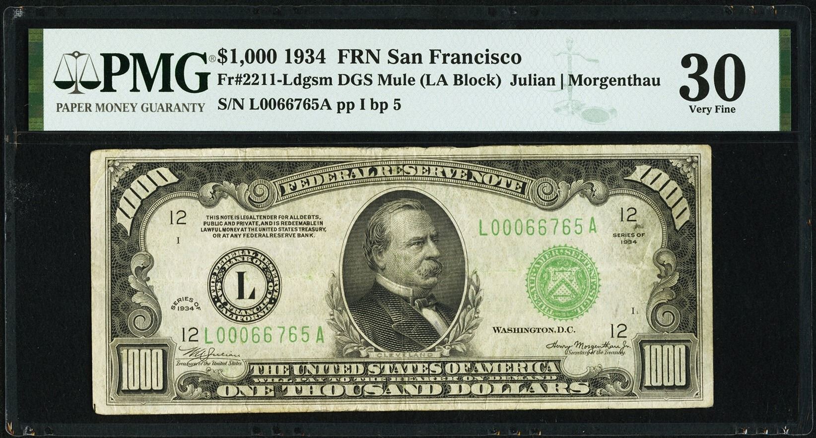 One 1934 $1000 San Francisco Federal Reserve Note PMG 30.