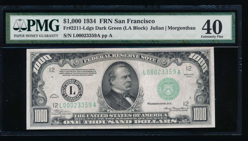 One 1934 $1000 San Francisco Federal Reserve Note PMG 40.