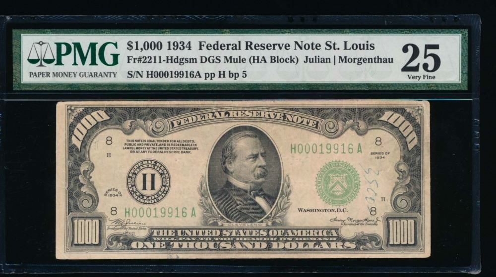 One 1934 $1000 St Louis Federal Reserve Note PMG 25.