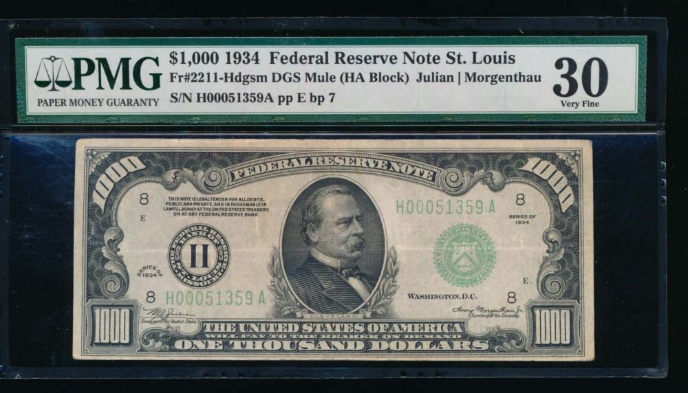 One 1934 $1000 St Louis Federal Reserve Note PMG 30.