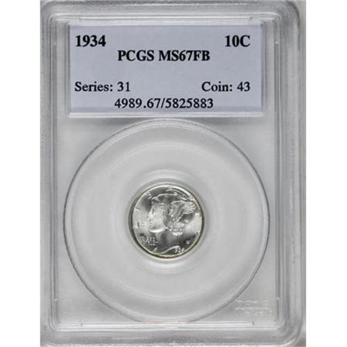 <B>1934 10C MS67 Full Bands PCGS.</B></I> PCGS Population (153/20). NGC Census: (57/7). Mintage: 24,080,000. Numismedia Wsl. Price for NGC/PCGS coin in MS67: $440. (#4989)<BR><BR><B>Coin Engraver:</B> Adolph A. Weinman<BR><BR><b>Shipping:</b> Coins & Currency (<a target="_blank" href="http://www.heritageauctions.com/common/shipping.php">view shipping information</a>)