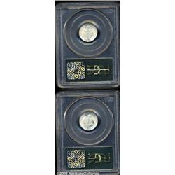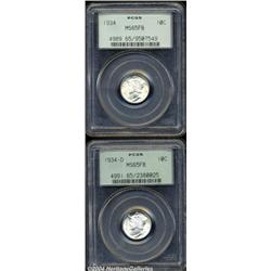 <B>1934<10C> MS65 Full Bands PCGS,</B></I> boldly struck with satiny grayish-white surfaces that seem to be unmarked on both sides of the coin; and a <B>1934-D MS65 Full Bands,</B></I> well struck and carefully preserved, with bright untoned surfaces.<BR><I>From The Reed Hawn Collection of Mercury Dimes.</B></I> 2 coins <BR><BR><B>Important notice:</B> Heritage usually auctions material at the rate of 200-250 lots per hour. On some occasions eBay Live bid software or the Internet may not be able to keep up with the pace of the auction. We recommend placing a realistic absentee bid now as insurance to avoid disappointment. Occasionally the auctioneer may eliminate or reject an eBay Live bid, and the auctioneer may also reopen a lot after the close of the eBay live bidding (usually because we missed an audience bid), and may reject your bid even if it shows you as the winning bidder. By bidding via eBay Live, you agree that Heritage may award the lot to another bidder at its sole discretion under the circumstances described above or any other reasonable circumstances. Since eBay bids are not shown to us until we open the lot on the floor, we treat those bids just like floor bids. In most cases the floor responds before the eBay bid is presented to us, due to Internet lag time, so for consistency we have made it a policy that floor bids are always considered first over tie eBay live bids. Also please note that all Heritage lots purchased through eBay Live carry a 20% Buyer's Premium. Please make sure you read the Terms and Conditions before you bid. </span></font></tr></table></td></tr></table>