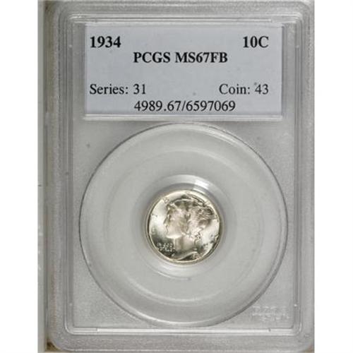 <B>1934 10C MS67 Full Bands PCGS.</B></I> Delicate ivory and sky-blue tints visit the shining surfaces of this decisively struck Superb Gem. Carefully preserved and exemplary in every respect. PCGS has graded 20 finer Full Bands pieces (10/07).<BR><BR><B>Coin Engraver:</B> Adolph A. Weinman<BR><BR><b>Shipping:</b> Coins & Currency (<a target="_blank" href="http://www.heritageauctions.com/common/shipping.php">view shipping information</a>)