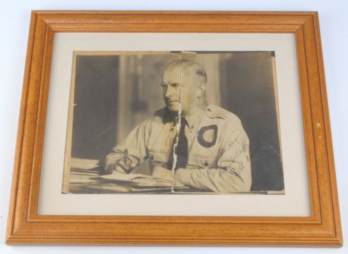 Monochrome photograph showing Eoin O'Duffy in Blueshirt uniform working at a desk. Signed and dated in lower right corner. Framed