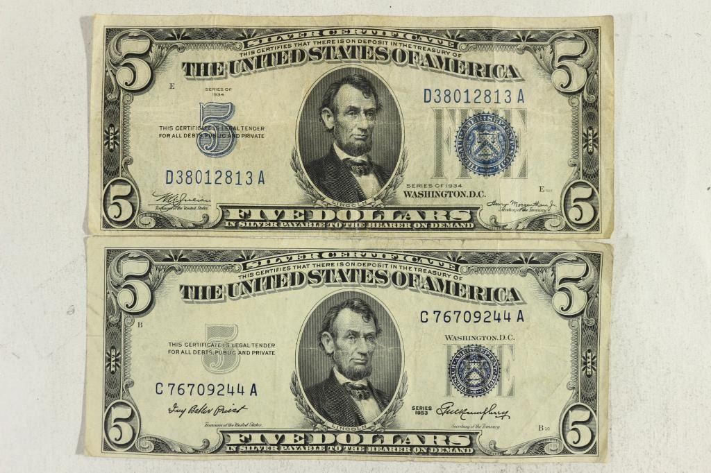 1934 & 1953 $5 SILVER CERTIFICATES BLUE SEALS