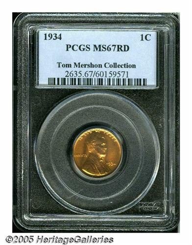 <B>1934<1C> MS67 Red PCGS.</B></I> Gorgeous copper-gold patina overlies bright lustrous surfaces. This coin has tremendous eye appeal.<BR><I>From The Tom Mershon #2 All-Time PCGS Registry Set of Lincoln Wheat Cents.</B></I>