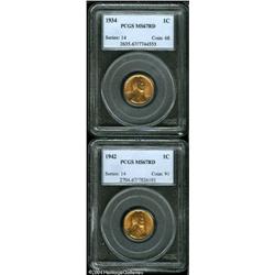 1934 1C MS67 Red PCGS, an absolutely splendid, see <B>1934 1C MS67 Red PCGS,</B></I> an absolutely splendid, seemingly pristine Superb Gem, well struck, fully lustrous, carbon-free, and nearly blemish-free; and a <B>1942 MS67 Red PCGS,</B></I> a bright radiantly lustrous coin that shows even mint red color, sharp details, and unabraded surfaces on both obverse and reverse.<BR><I>From The Dennis Dewart Collection.</B></I> 2 Coins <BR><BR><B>Important notice:</B> Heritage usually auctions material at the rate of 200-250 lots per hour. On some occasions eBay Live bid software or the Internet may not be able to keep up with the pace of the auction. We recommend placing a realistic absentee bid now as insurance to avoid disappointment. Occasionally the auctioneer may eliminate or reject an eBay Live bid, and the auctioneer may also reopen a lot after the close of the eBay live bidding (usually because we missed an audience bid), and may reject your bid even if it shows you as the winning bidder. By bidding via eBay Live, you agree that Heritage may award the lot to another bidder at its sole discretion under the circumstances described above or any other reasonable circumstances. Since eBay bids are not shown to us until we open the lot on the floor, we treat those bids just like floor bids. In most cases the floor responds before the eBay bid is presented to us, due to Internet lag time, so for consistency we have made it a policy that floor bids are always considered first over tie eBay live bids. Also please note that all Heritage lots purchased through eBay Live carry a 20% Buyer's Premium. Please make sure you read the Terms and Conditions before you bid. This lot is being auctioned in conjunction with a live floor auction by Heritage Galleries & Auctioneers. All final auction and invoice information will be supplied by Heritage Galleries & Auctioneers, and all other information should be considered preliminary. Lot:5175