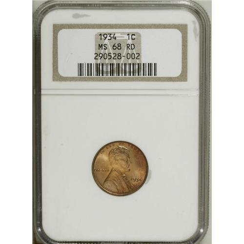 <B>1934 1C MS68 Red NGC.</B></I> A meticulously struck Superb Gem that displays booming luster throughout the immaculate surfaces. Pumpkin-gold dominates the centers and left margins, while cherry-red and apple-green grace the right borders. An opportunity for the Registry collector. Census: 3 in 68 Red, 0 finer (11/06).<BR><BR><b>Shipping:</b> Coin/Currency (<a target="_blank" href="http://www.heritageauctions.com/common/shipping.php">view shipping information</a>)