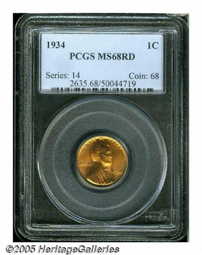 <B>1934<1C> MS68 Red PCGS.</B></I> One of only seven pieces certified as MS68 Red by PCGS, with none finer at either service (6/05). The surfaces are virtually flawless with smooth, rippling mint luster that is undisturbed by post-striking impairments. This coin is destined for a truly high grade Lincoln Cent set.<BR><I>From The William Bickel Collection, Part One.</B></I>
