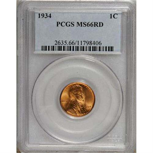 <B>1934 1C MS66 Red PCGS.</B></I> PCGS Population (1035/247). NGC Census: (757/370). Mintage: 219,080,000. Numismedia Wsl. Price for NGC/PCGS coin in MS66: $55. (#2635)<BR><BR><B>Coin Engraver:</B> Victor D. Brenner<BR><BR><b>Shipping:</b> Coins & Currency (<a target="_blank" href="http://www.heritageauctions.com/common/shipping.php">view shipping information</a>)