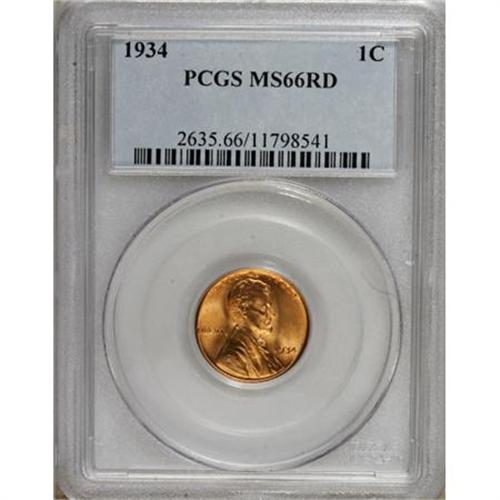 <B>1934 1C MS66 Red PCGS.</B></I> PCGS Population (1035/247). NGC Census: (757/370). Mintage: 219,080,000. Numismedia Wsl. Price for NGC/PCGS coin in MS66: $55. (#2635)<BR><BR><B>Coin Engraver:</B> Victor D. Brenner<BR><BR><b>Shipping:</b> Coins & Currency (<a target="_blank" href="http://www.heritageauctions.com/common/shipping.php">view shipping information</a>)