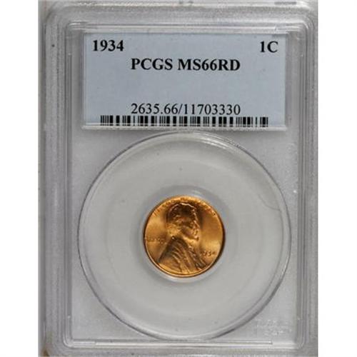 <B>1934 1C MS66 Red PCGS.</B></I> PCGS Population (1036/248). NGC Census: (757/370). Mintage: 219,080,000. Numismedia Wsl. Price for NGC/PCGS coin in MS66: $55. (#2635)<BR><BR><B>Coin Engraver:</B> Victor D. Brenner<BR><BR><b>Shipping:</b> Coins & Currency (<a target="_blank" href="http://www.heritageauctions.com/common/shipping.php">view shipping information</a>)