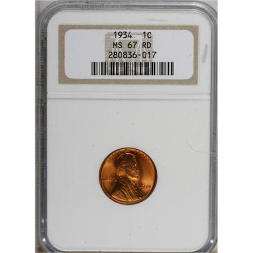 <B>1934 1C MS67 Red NGC.</B></I> NGC Census: (367/3). PCGS Population (241/7). Mintage: 219,080,000. Numismedia Wsl. Price for NGC/PCGS coin in MS67: $150. (#2635)<BR><BR><B>Coin Engraver:</B> Victor D. Brenner<BR><BR><b>Shipping:</b> Coins & Currency (<a target="_blank" href="http://www.heritageauctions.com/common/shipping.php">view shipping information</a>)