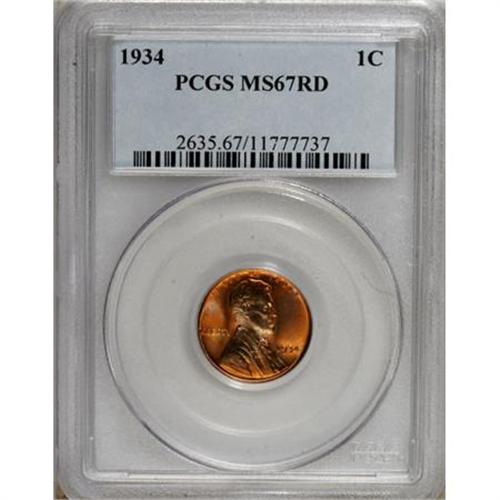 <B>1934 1C MS67 Red PCGS.</B></I> PCGS Population (240/7). NGC Census: (367/3). Mintage: 219,080,000. Numismedia Wsl. Price for NGC/PCGS coin in MS67: $150. (#2635)<BR><BR><B>Coin Engraver:</B> Victor D. Brenner<BR><BR><b>Shipping:</b> Coins & Currency (<a target="_blank" href="http://www.heritageauctions.com/common/shipping.php">view shipping information</a>)