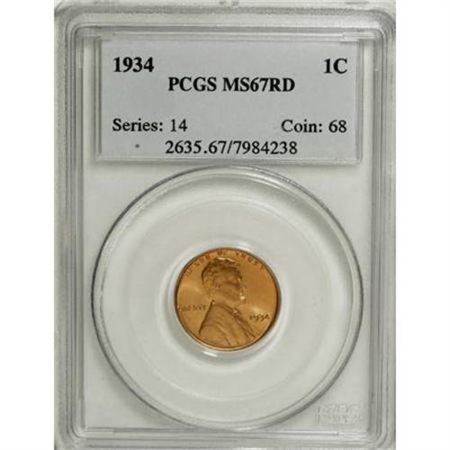 <B>1934 1C MS67 Red PCGS.</B></I> PCGS Population (241/7). NGC Census: (367/3). Mintage: 219,080,000. Numismedia Wsl. Price for NGC/PCGS coin in MS67: $150. (#2635)<BR><BR><B>Coin Engraver:</B> Victor D. Brenner<BR><BR><b>Shipping:</b> Coins & Currency (<a target="_blank" href="http://www.heritageauctions.com/common/shipping.php">view shipping information</a>)