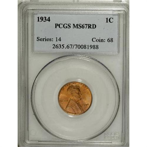 <B>1934 1C MS67 Red PCGS.</B></I> PCGS Population (241/7). NGC Census: (367/3). Mintage: 219,080,000. Numismedia Wsl. Price for NGC/PCGS coin in MS67: $150. (#2635)<BR><BR><B>Coin Engraver:</B> Victor D. Brenner<BR><BR><b>Shipping:</b> Coins & Currency (<a target="_blank" href="http://www.heritageauctions.com/common/shipping.php">view shipping information</a>)