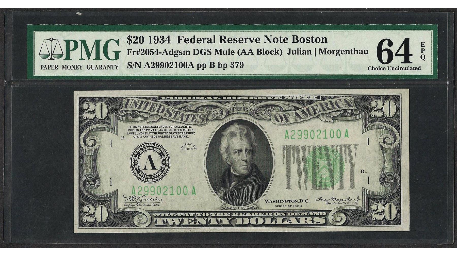 1934 $20 Federal Reserve Note Boston Fr.2054-A PMG Choice Uncirculated 64EPQ