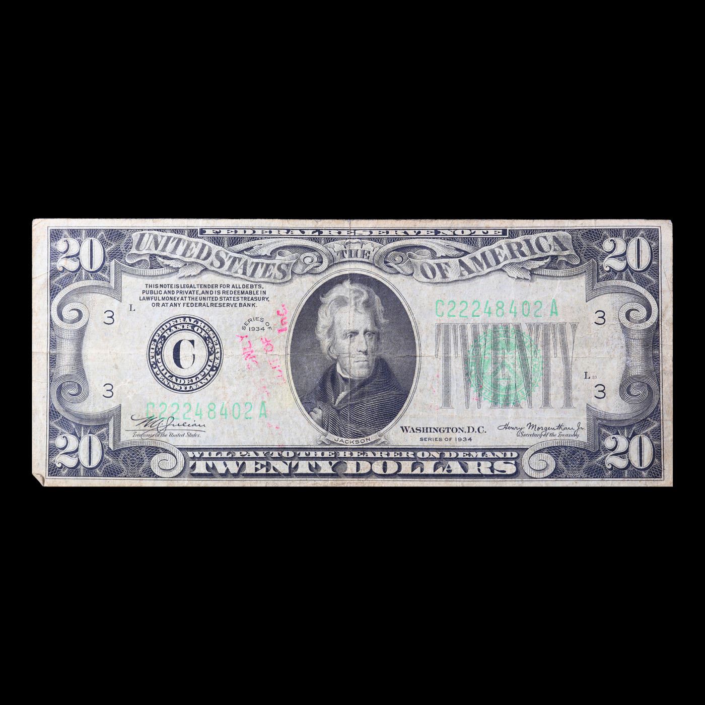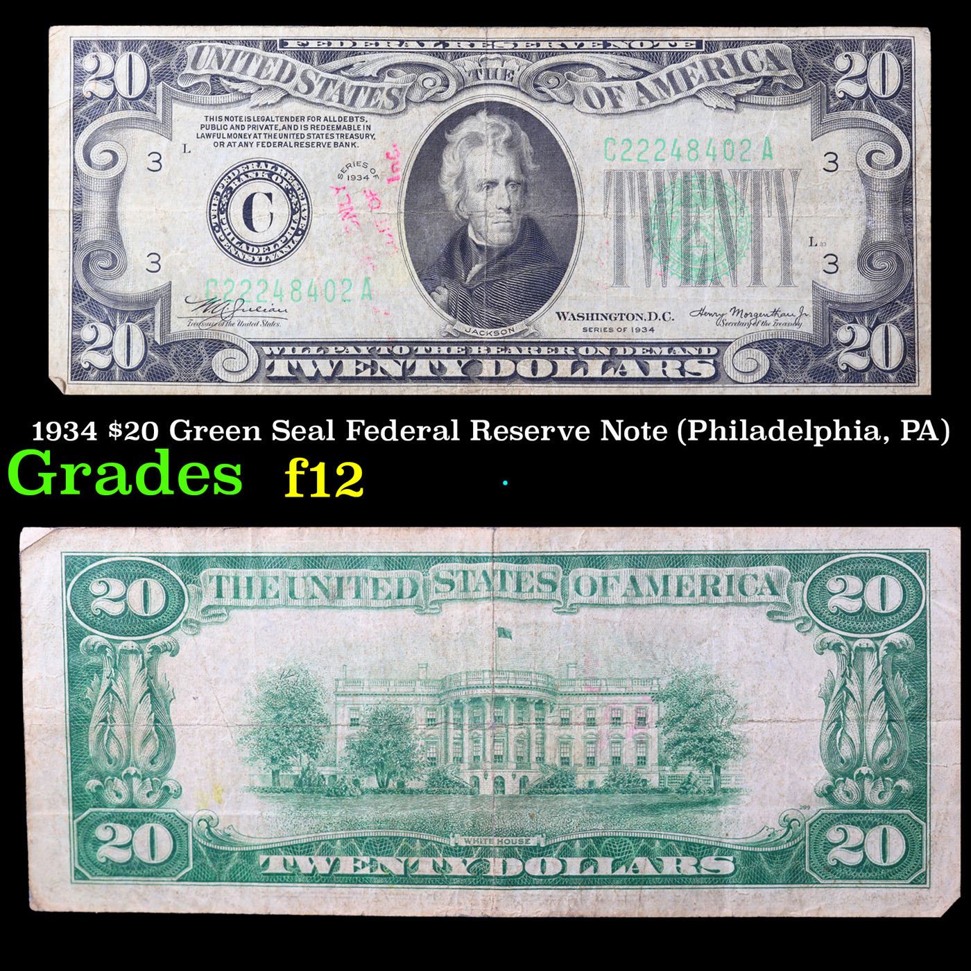 1934 $20 Green Seal Federal Reserve Note (Philadelphia, PA) Grades f, fine