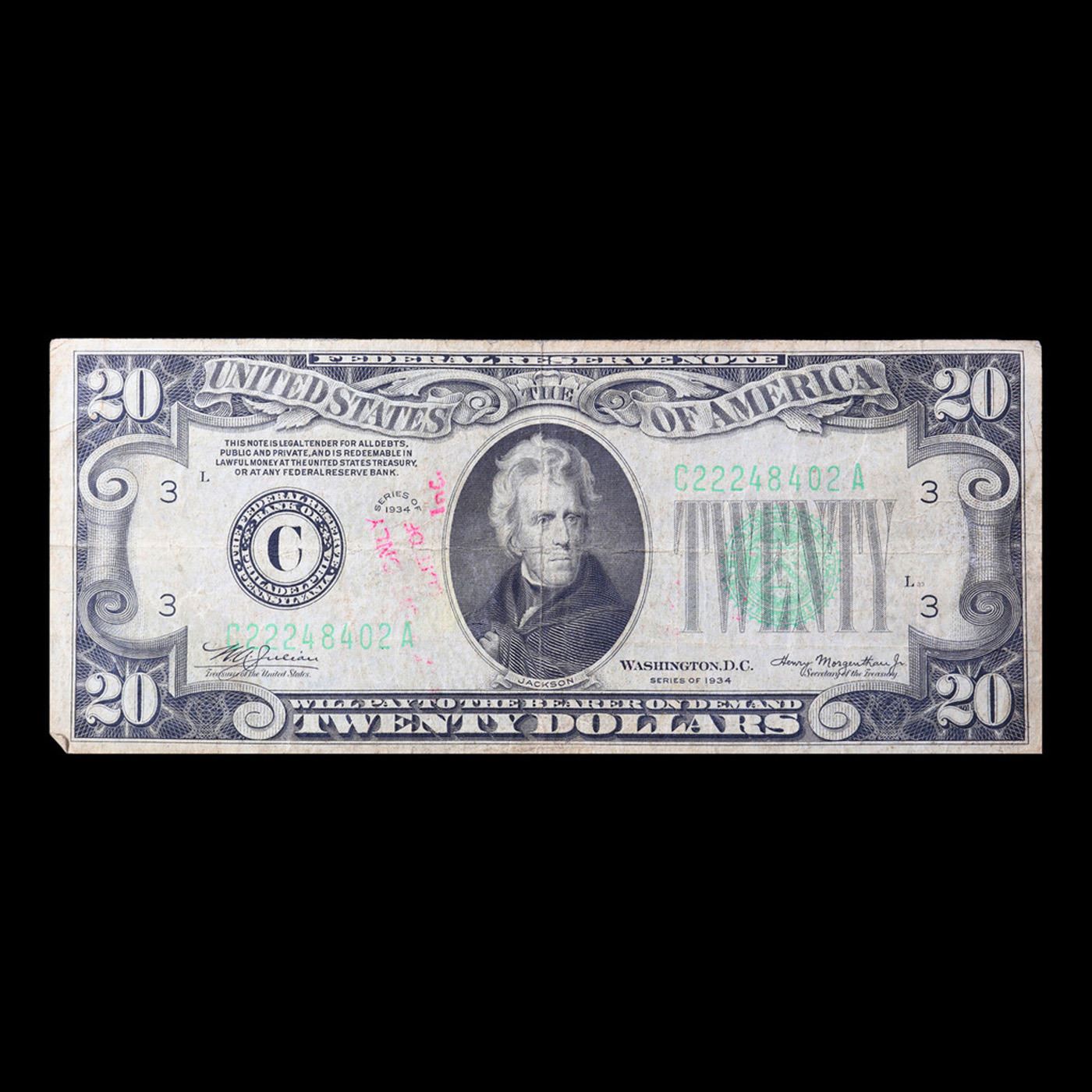 1934 $20 Green Seal Federal Reserve Note (Philadelphia, PA) Grades f, fine.