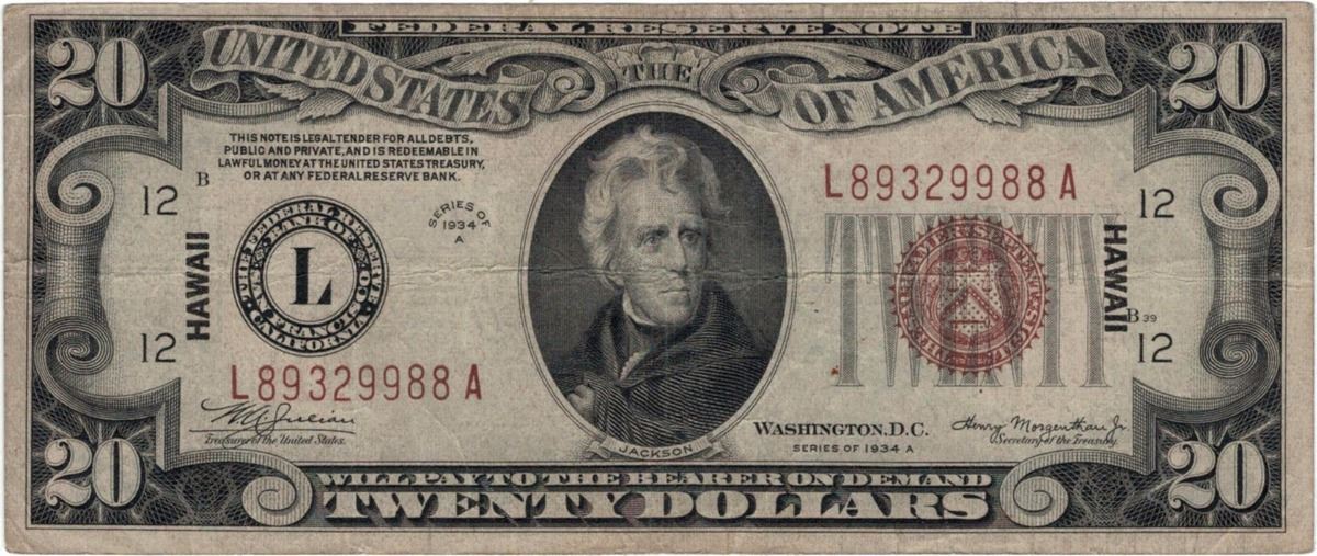 1934 $20 Hawaii Federal Reserve Note Currency.
