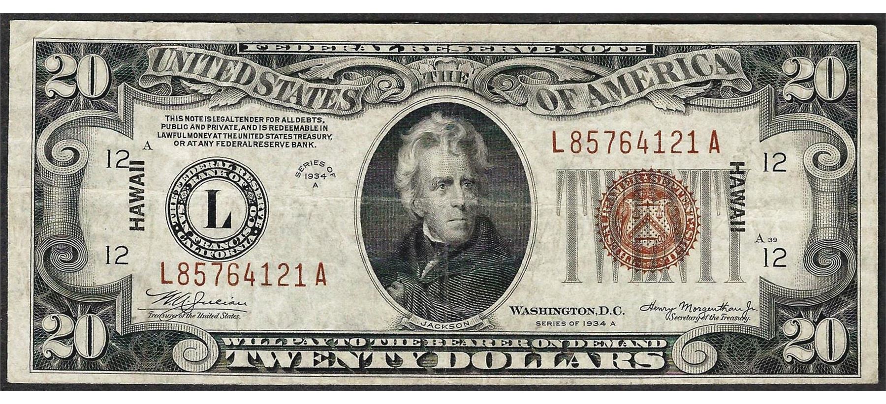 One 1934 $20 Hawaii Federal Reserve Note WWII Emergency Note.