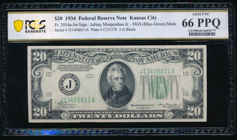 One 1934 $20 Kansas City FRN PCGS 66PPQ.