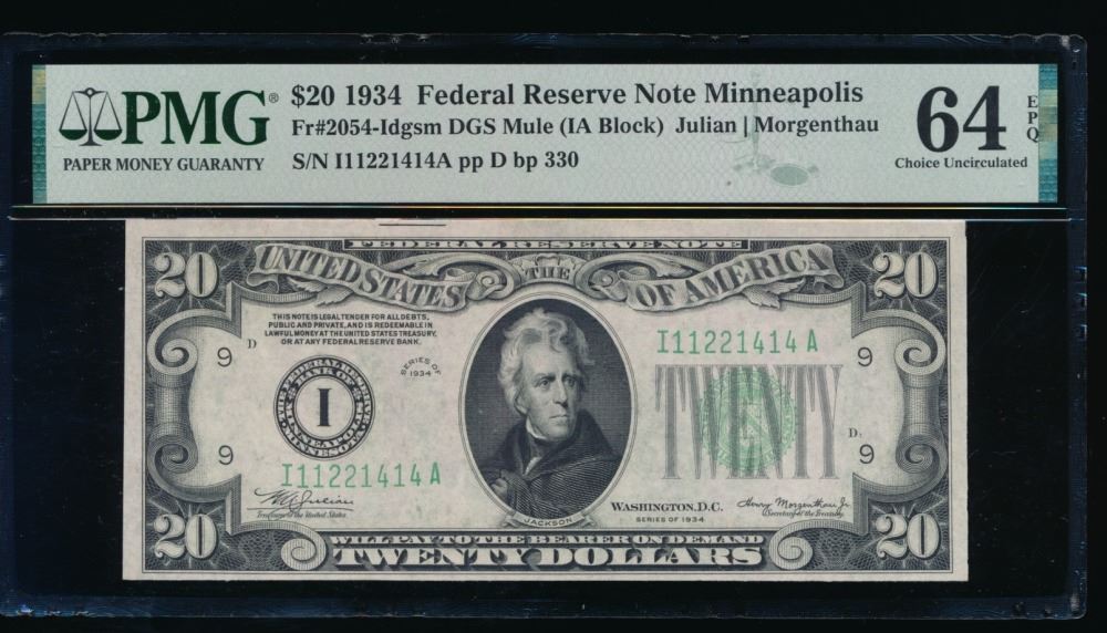 One 1934 $20 Minneapolis FRN PMG 64EPQ.
