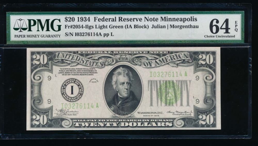One 1934 $20 Minneapolis Federal Reserve Note PMG 64EPQ.