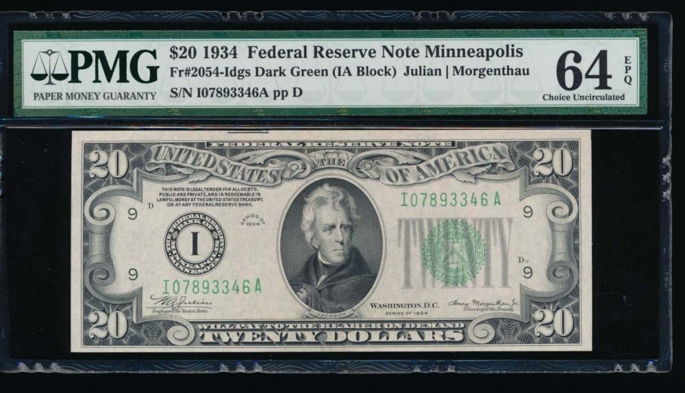 One 1934 $20 Minneapolis Federal Reserve Note PMG 64EPQ.