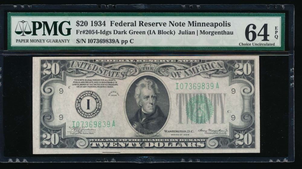 One 1934 $20 Minneapolis Federal Reserve Note PMG 64EPQ.
